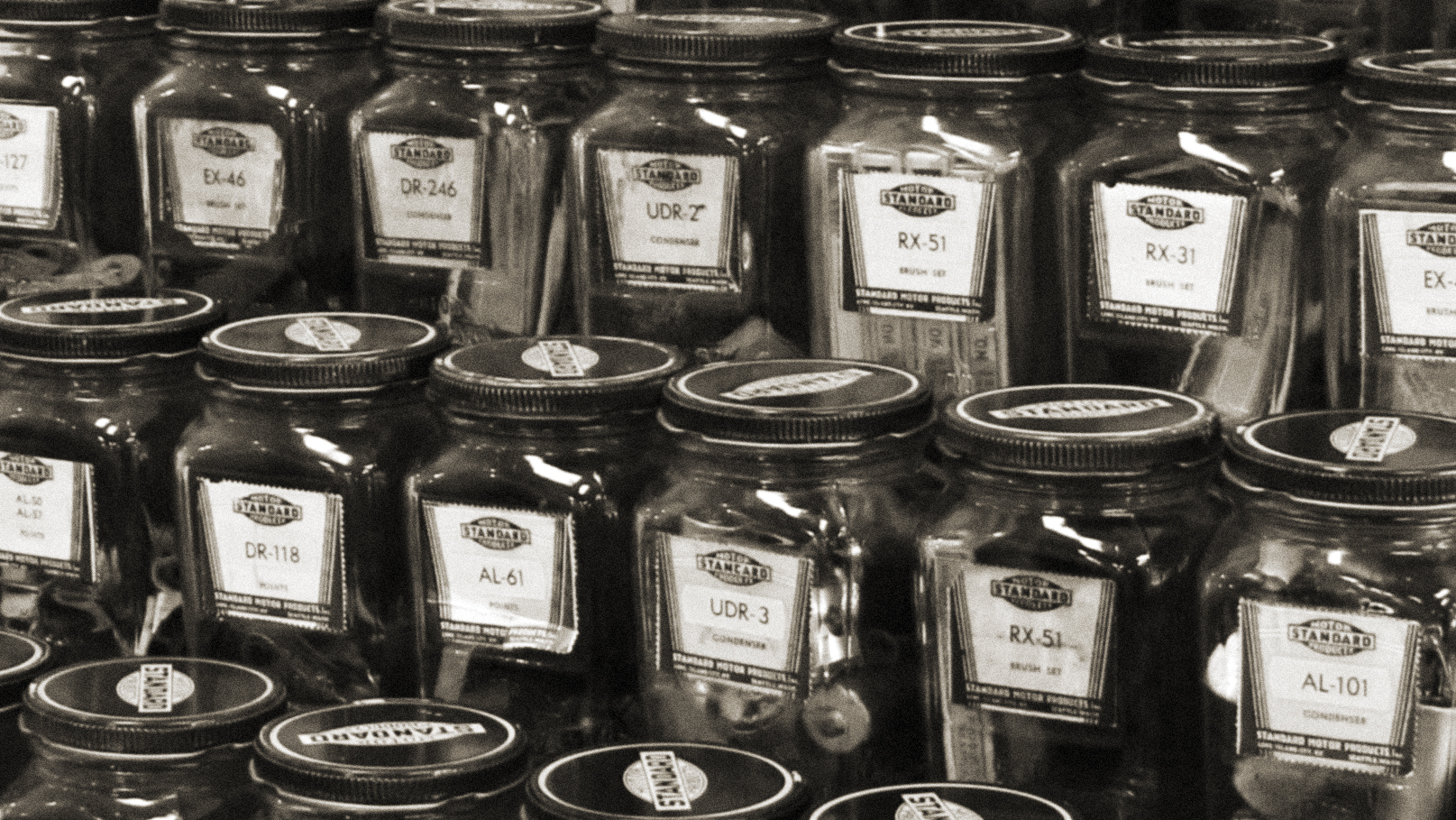 SMP begins manufacturing automotive ignition parts. Shipped from Standard in bulk, these ignition parts were stored by installers in glass jars (pictured). As inventories grew and part numbers multiplied, individual cardboard folding cartons replaced the glass jar storage system.